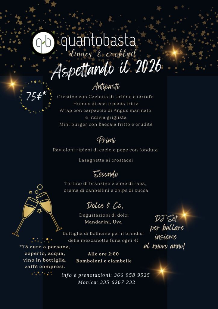 Home Brindiamo al nuovo anno! Pubblicato da qubicaffe il 09/11/202509/11/2025 Brindiamo insieme al nuovo anno! Il prezzo di 75 euro per il cenone del 31.12.2025 è tutto compreso e prevede, le pietanze, acqua, vino, caffè e coperto. Prenota adesso il tuo tavolo al: 366 958 9525 (anche whatsapp) i posti sono limitati! Condividi: Fai clic per condividere su X (Si apre in una nuova finestra) X Fai clic per condividere su Facebook (Si apre in una nuova finestra) Facebook Mi piace Caricamento... Related